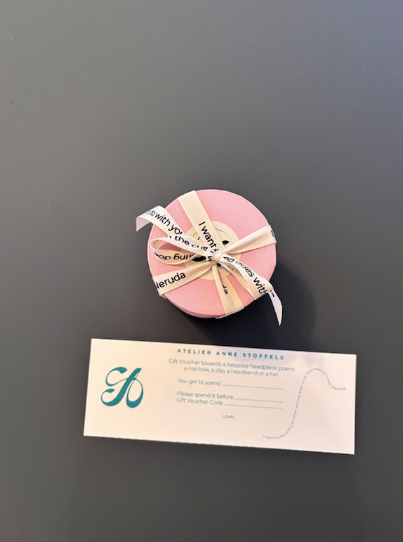 The gift voucher comes in the littlest of pink hat boxes, wrapped in Pablo Neruda's words: " I want to do with you, what spring does with the cherry trees"