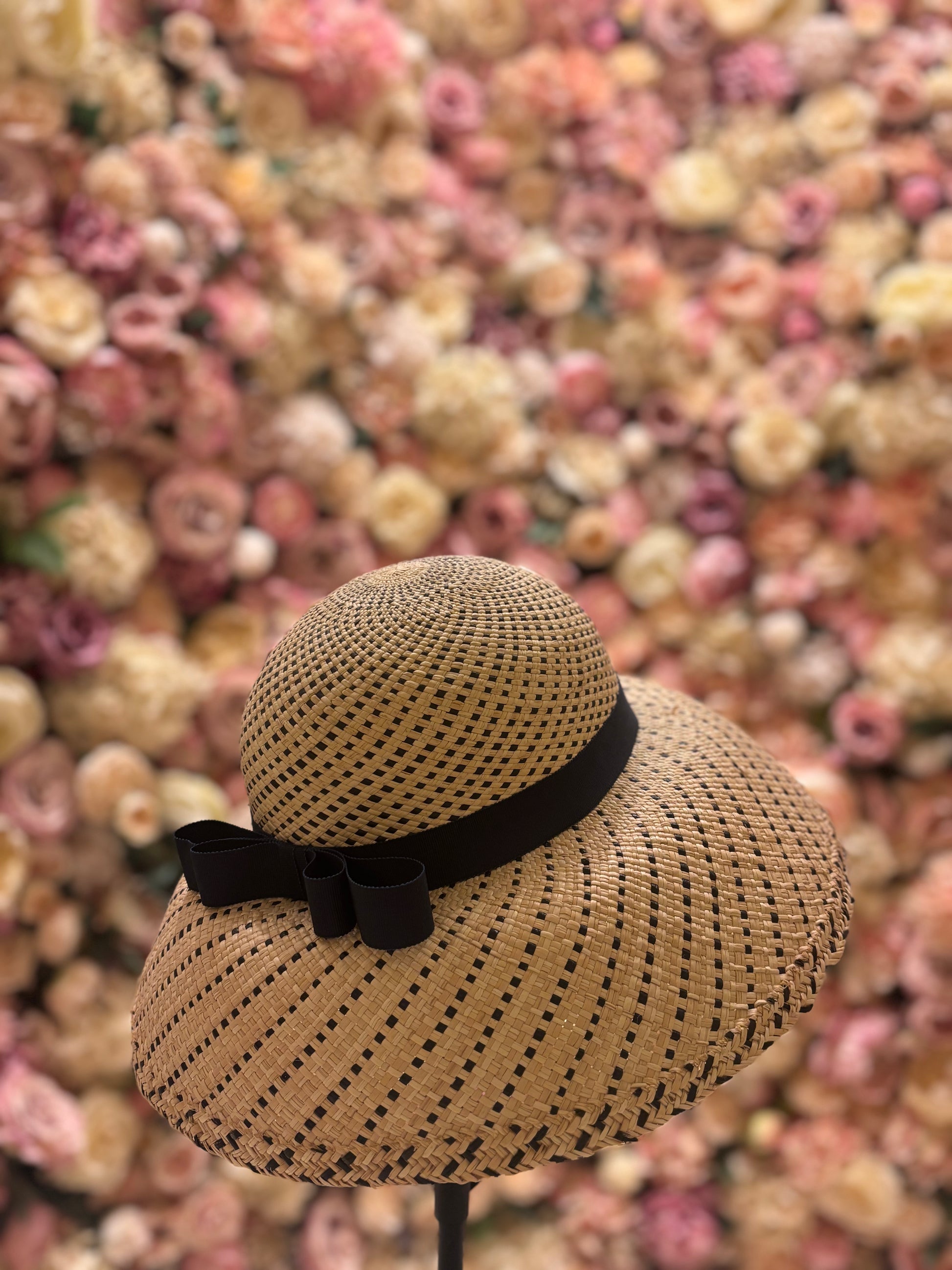 This handcrafted hat combines natural straw with dark blue accents woven throughout, creating a timeless design. Featuring a large brim, it offers both elegance and practical sun protection, making it ideal for everyday wear and special occasions. Meticulously crafted in our Antwerp atelier using traditional techniques, this couture piece reflects expert craftsmanship and enduring style.
