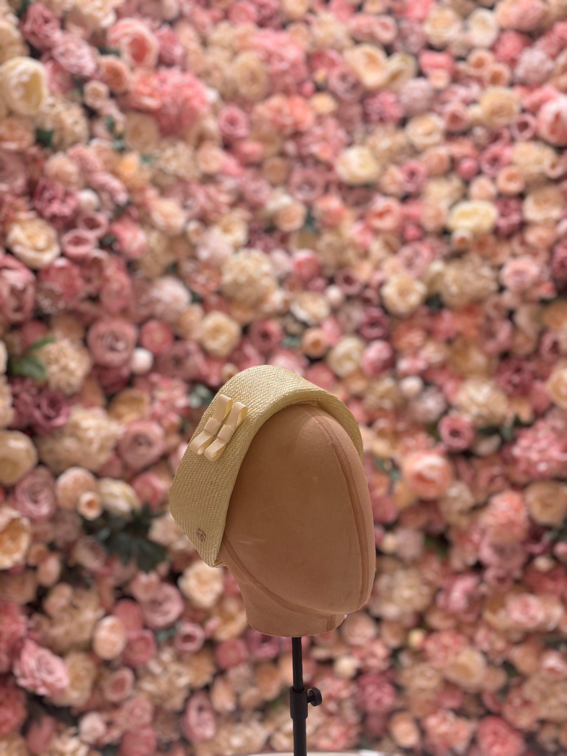 This exquisite lemon sailor-style headpiece is meticulously handcrafted in our Antwerp atelier, embodying couture elegance. Featuring delicate Petersham ribbon bow details, it offers a refined touch that complements sophisticated ensembles. Perfect for those seeking a unique accessory with artisanal quality and timeless charm.